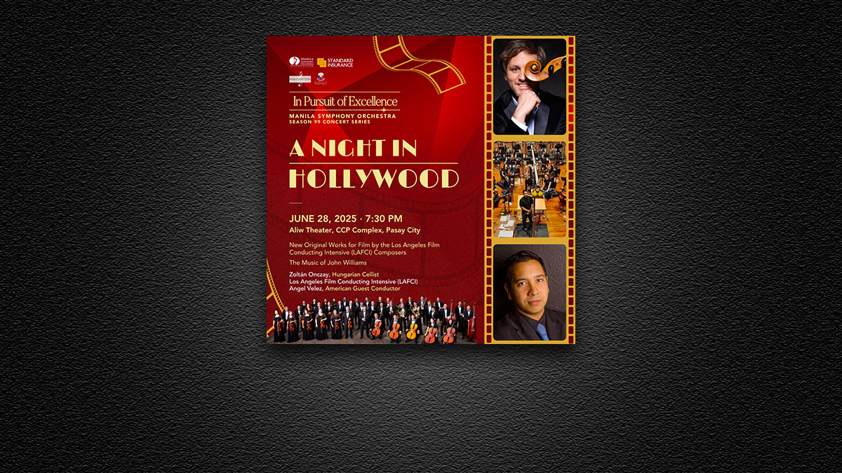 The Manila Symphony Orchestra presents A Night in Hollywood, the second concert in its 99th season, happening on June 28, 2025, Saturday at 7:30 PM at the ALIW Theater, CCP Complex, Pasay City.